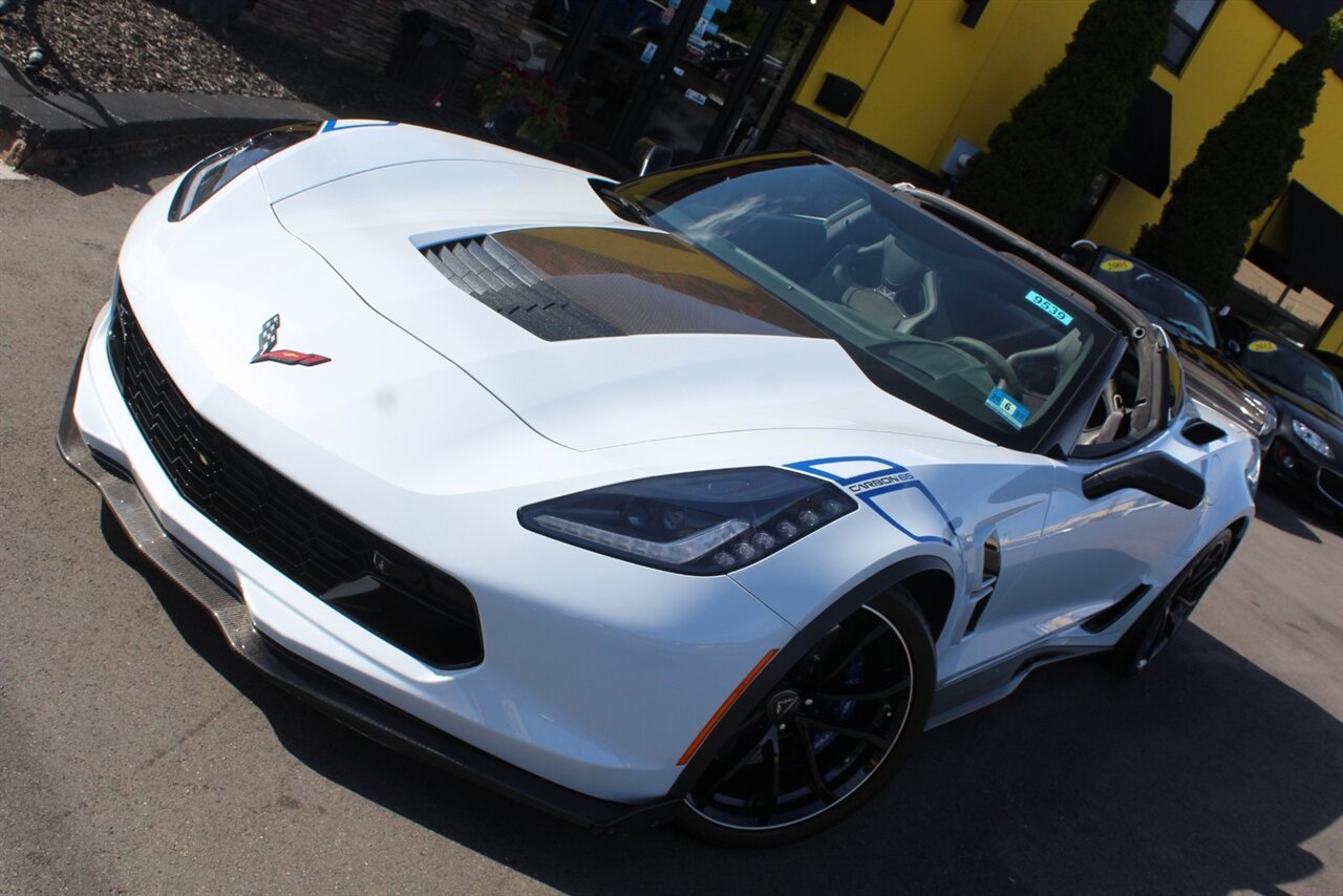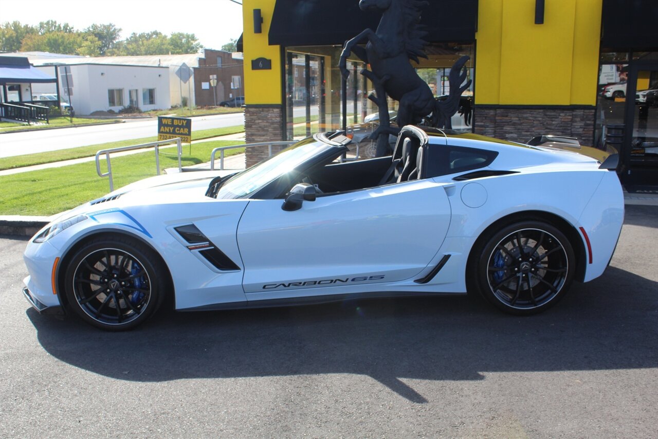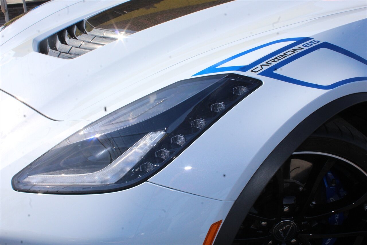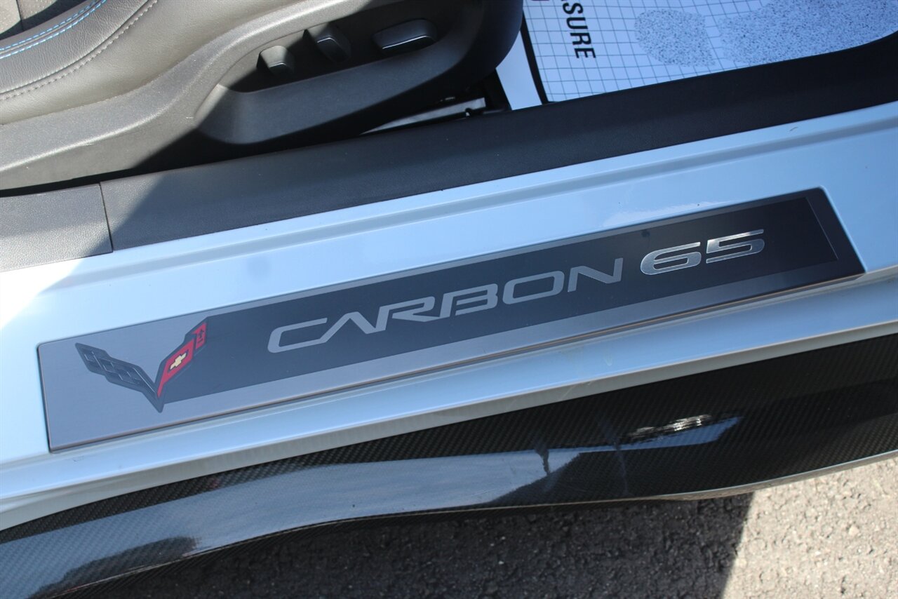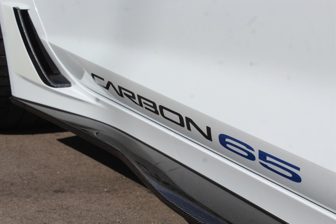 - Carbon 65 EditionIncludes Carbon 65 fender and door graphics, carbon flash badge package, carbon flash painted outside mirrors, exposed carbon rear spoiler, exposed carbon fiber weave hood insert, exposed carbon fiber splitter and rockers, Grand Sport style 19 x 10 inch front and 20 x 12 inch rear black aluminum wheels, carbon fiber wheel center caps with crossed flag logo, visible carbon fiber removable roof panel, Carbon Edition sill plates, and blue contrast stitching on seats, instrument panel, doors, console, shifter, boot and shift paddles.