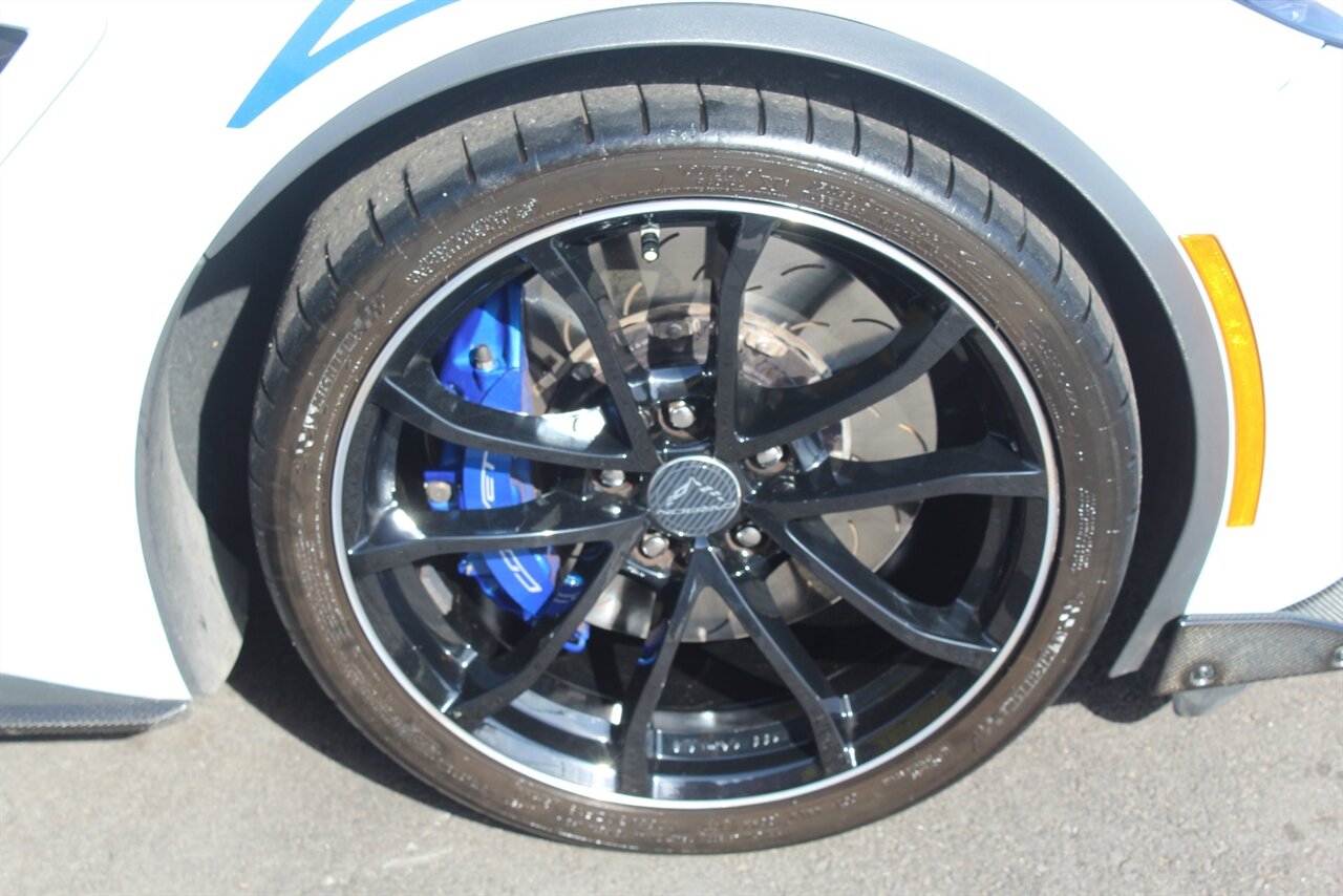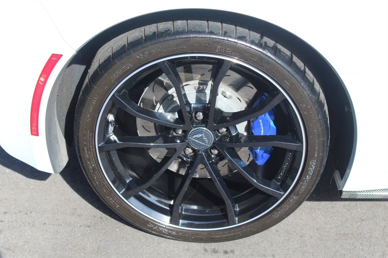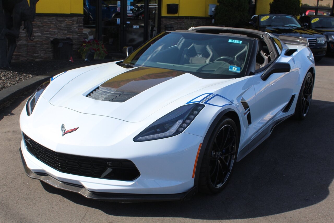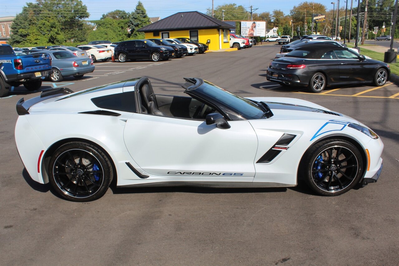 - Carbon 65 EditionIncludes Carbon 65 fender and door graphics, carbon flash badge package, carbon flash painted outside mirrors, exposed carbon rear spoiler, exposed carbon fiber weave hood insert, exposed carbon fiber splitter and rockers, Grand Sport style 19 x 10 inch front and 20 x 12 inch rear black aluminum wheels, carbon fiber wheel center caps with crossed flag logo, visible carbon fiber removable roof panel, Carbon Edition sill plates, and blue contrast stitching on seats, instrument panel, doors, console, shifter, boot and shift paddles.