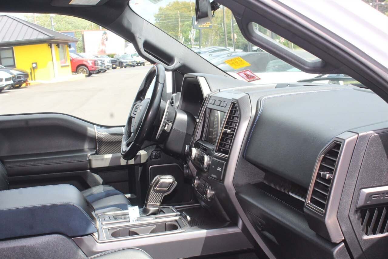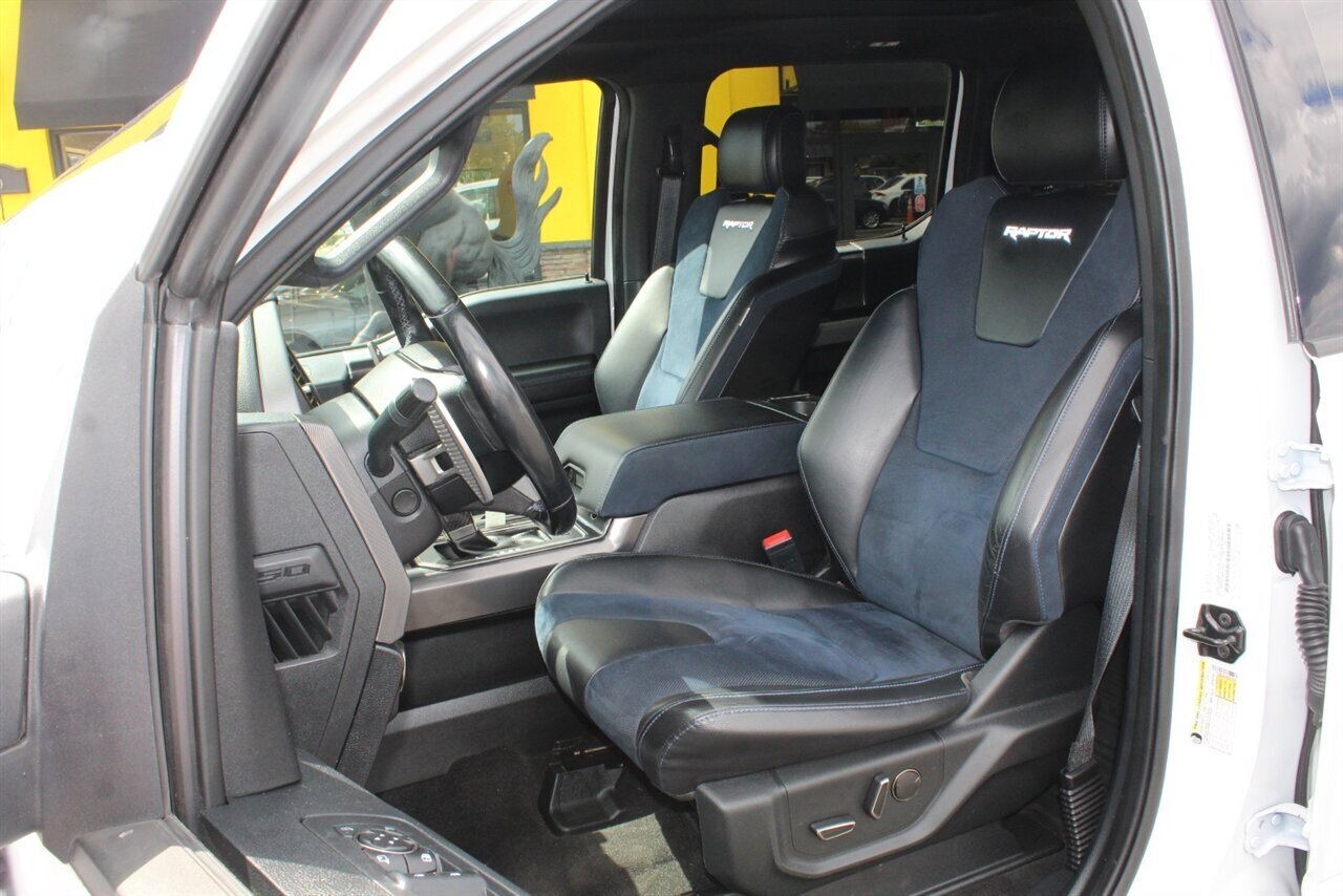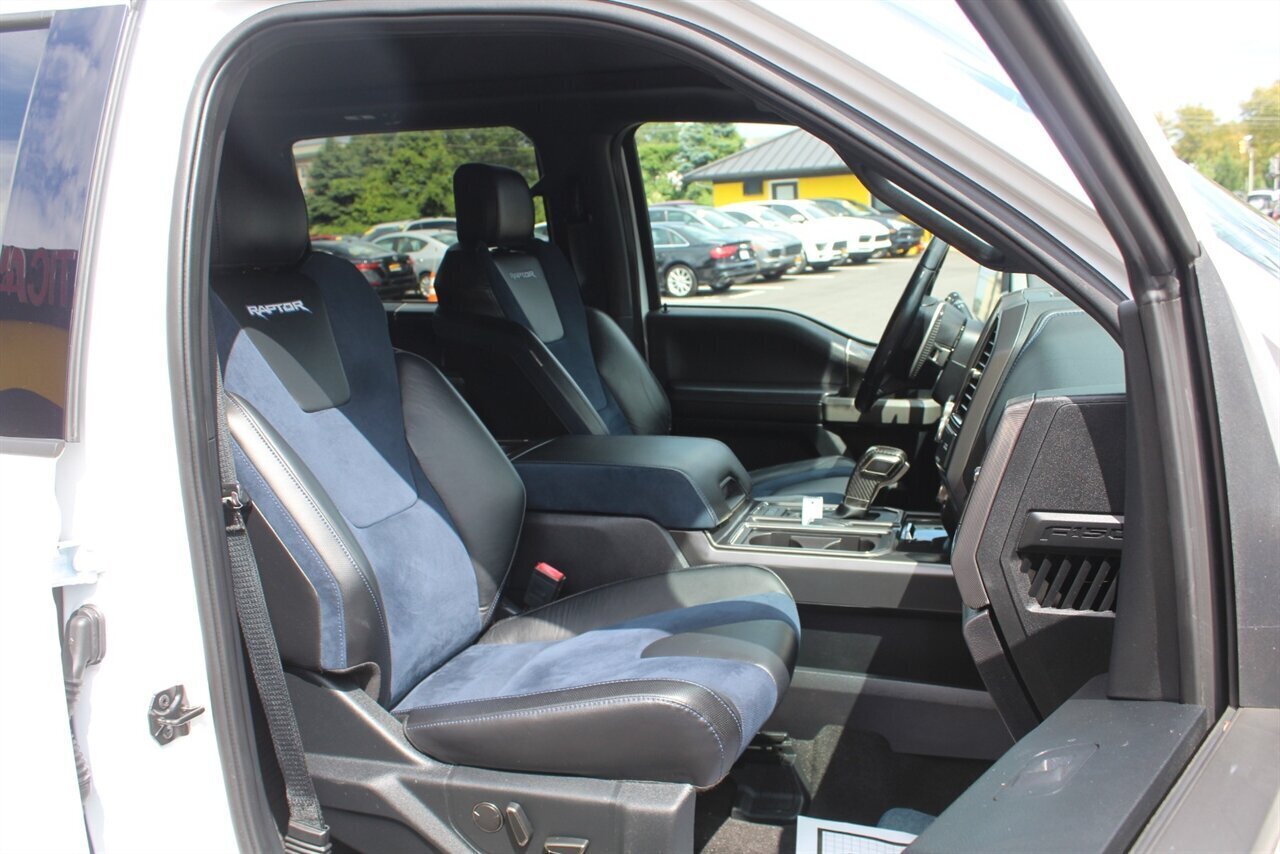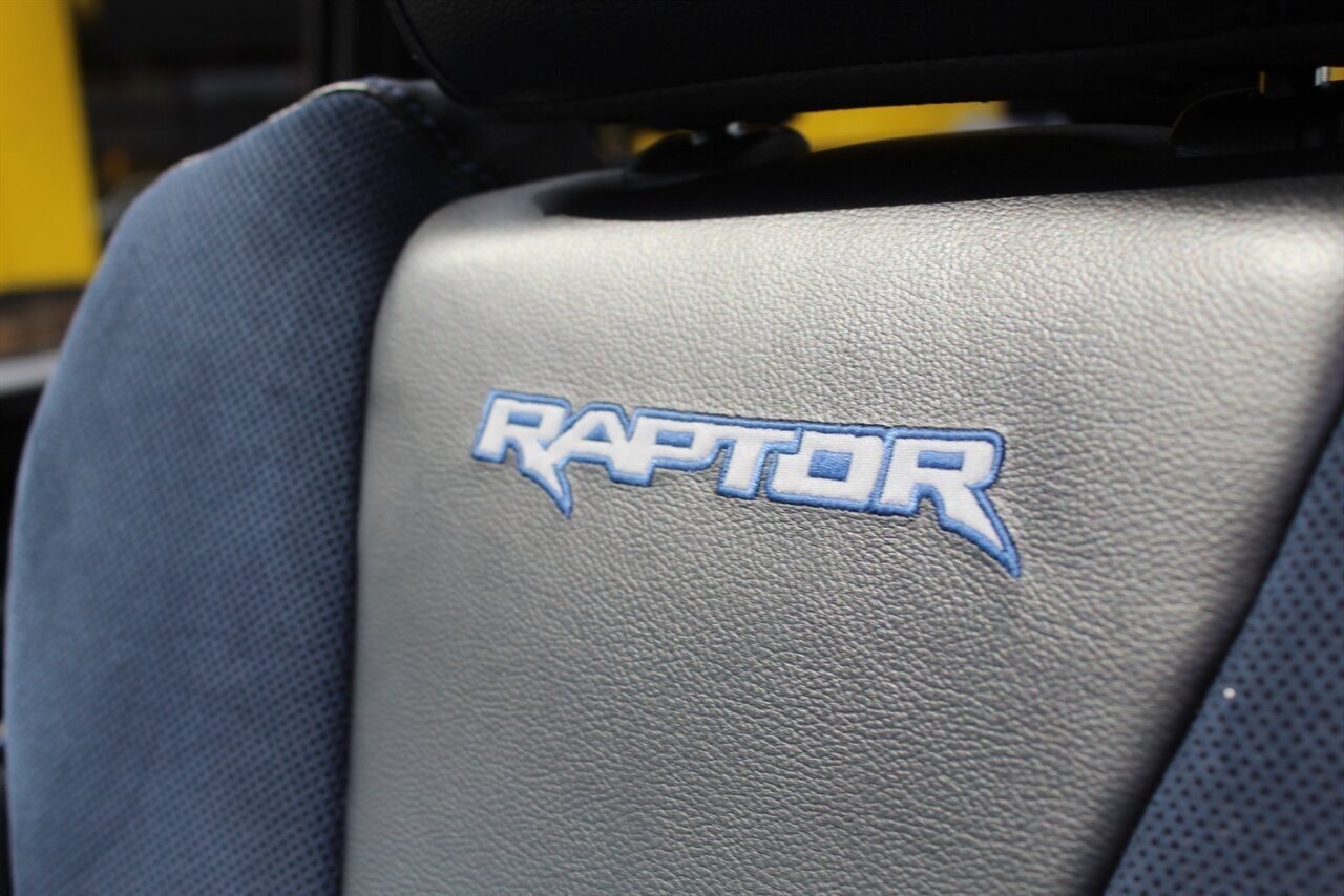 - Raptor Blue Accent PackageIncludes 10-way power adjustable unique leather/alcantara Recaro front seats with blue accents, aluminum dash trim, blue accents for console, and unique carbon fiber shift knob, dash applique, door applique, and media bin door.