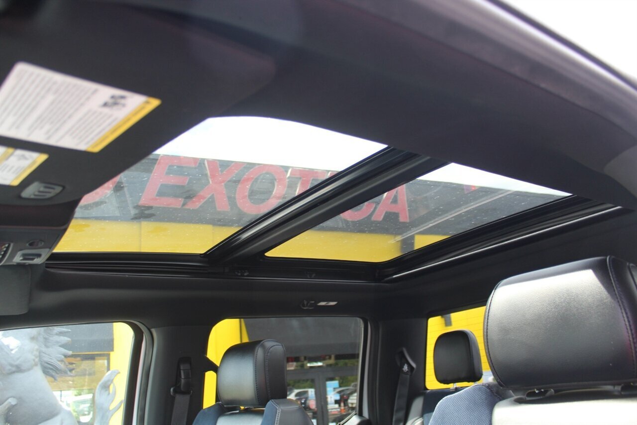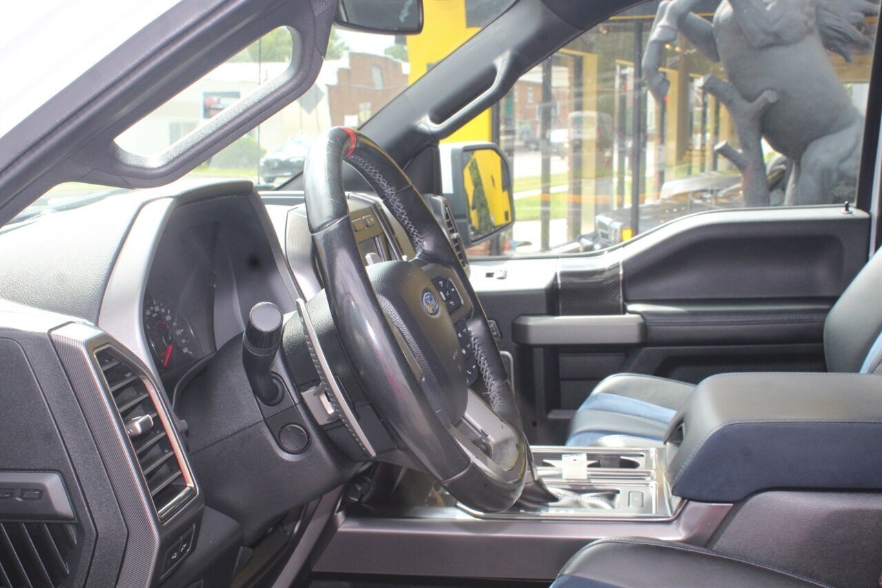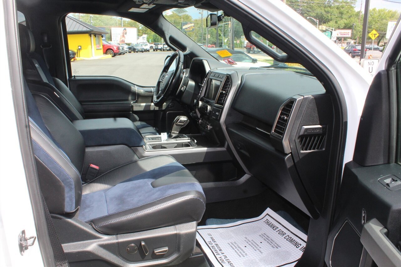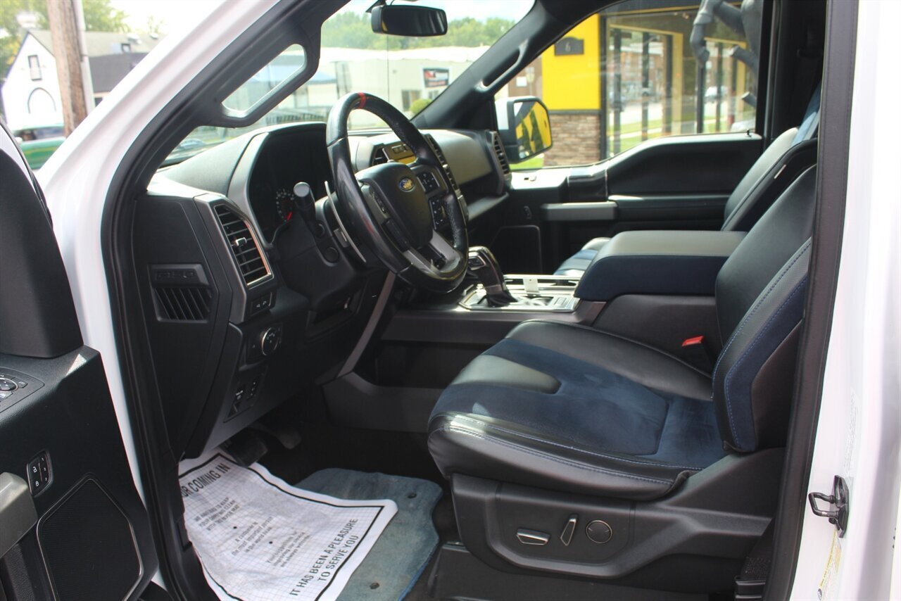 - Raptor Blue Accent PackageIncludes 10-way power adjustable unique leather/alcantara Recaro front seats with blue accents, aluminum dash trim, blue accents for console, and unique carbon fiber shift knob, dash applique, door applique, and media bin door.