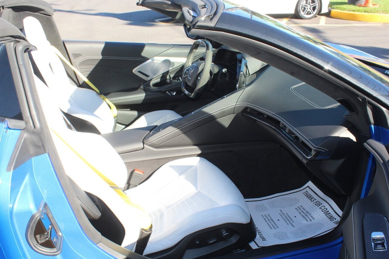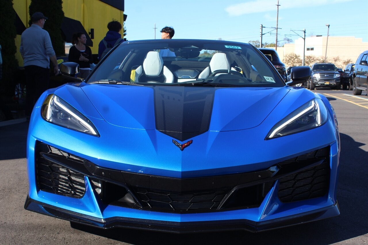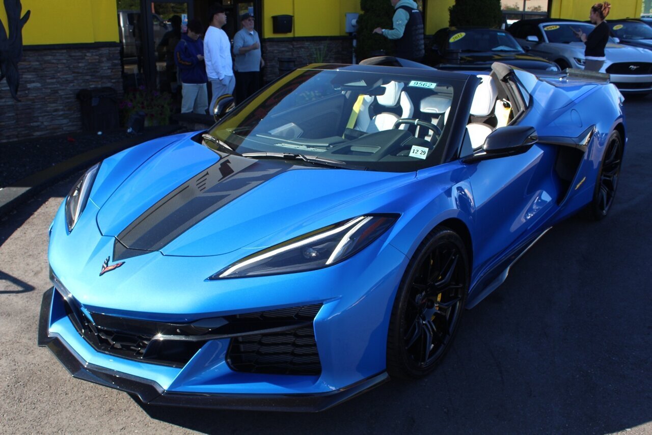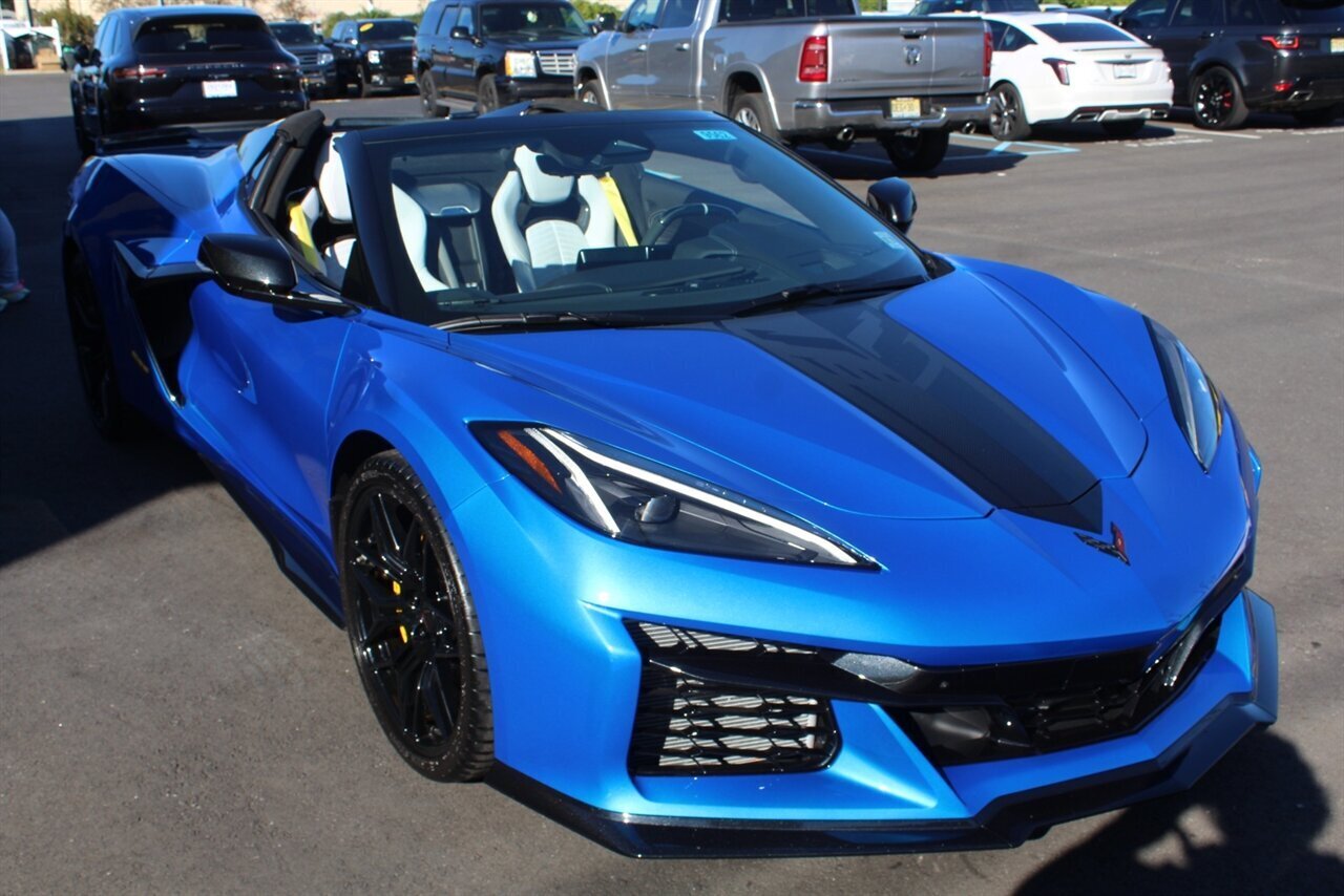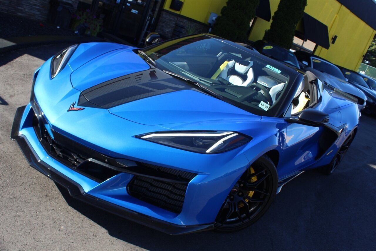 UP FOR SALE IS A PRISTINE 2024 CHEVROLET CORVETTE Z06 3LZ CONVERTIBLE. PAINTED IN A RIPTIDE BLUE METALLIC WITH SKY COOL GRAY /JET BLACK OVERRIDE ($695) NAPPA LEATHER & ALCANTARA SUEDE INTERIOR AND A POWER RETRACTING CARBON FLASH HARD-TOP ($1,295). THIS CORVETTE IS POWERED BY A 5.5L LT6 V8 GENERATING 670 HP & 460 LBS-FT AND A 8 SPEED DUAL CLUTCH AUTOMATIC WITH 4 SELECTABLE DRIVE MODES (TOUR/SPORT/TRACK/A CUSTOM "Z" MODE).THIS CORVETTE IS OPTIONED WITH A FRONT AXLE LIFT SYSTEM ($2,595), WHICH GIVES THIS CORVETTE THE ABILITY TO ADJUST THE HEIGHT OF THE FRONT SUSPENSION AT THE PUSH OF A BUTTON, OR AUTOMATICALLY WITH THE LOCATION MEMORY FEATURE. THE EXTERIOR IS BEAUTIFULY APPOINTED WITH CARBON FLASH PAINTED GROUND EFFECTS ($2,995) AND MIRROR COVERS ($195), A SET OF 20" /21" SPIDER DESIGN BLACK FORGED ALUMINUM WHEELS ($495) WITH BRIGHT YELLOW PAINTED BRAKE CALIPERS, AND THE C8.R JAKE GRAPHICS PACKAGE ($895). THIS CORVETTE IS LOADED WITH BOTH LUXURY & TECH, SUCH AS A NAPPA LEATHER TRIMMED INTERIOR WITH SUEDE HEADLINER, HEATED & COOLED, FULL POWER, NAPPA LEATHER / ALCANTARA SUEDE TRIMMED GT2 BUCKET SEATS WITH A HEATED ALCANTARA SUEDE / CARBON FIBER TRIMMED STEERING WHEEL ($695). INFOTAINMENT IS PROVIDED BY CHEVY'S MYLINK BLUETOOTH & NAVIGATION SYSTEM WITH A 14 SPEAKER BOSE PERFORMANCE SERIES SOUND SYSTEM, AS WELL AS A HEADS-UP DISPLAY WITH REAR-VIEW CAMERA MIRROR & AUTO-HIGH BEAMS, AND BLIND-SPOT, LANE-KEEP, AND FORWARD COLLISION ASSISTS WITH SURROUND-VIEW CAMERA AND FRONT & REAR PARKING DISTANCE SENSORS.